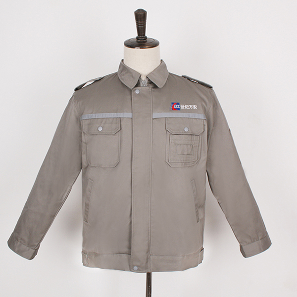 这款长袖工作服是我们专门为世纪万安设计定制的一款秋季工作服,采用涤棉纱卡面料。尖翻领暗门襟带拉链,前后都设计有反光条方便夜间作业,前胸采用抹角平贴兜,左前胸可放工卡。底围加小袢,可调节肥瘦。您有意定制请联系我们工服美客服。可根据您的实际要求定做。