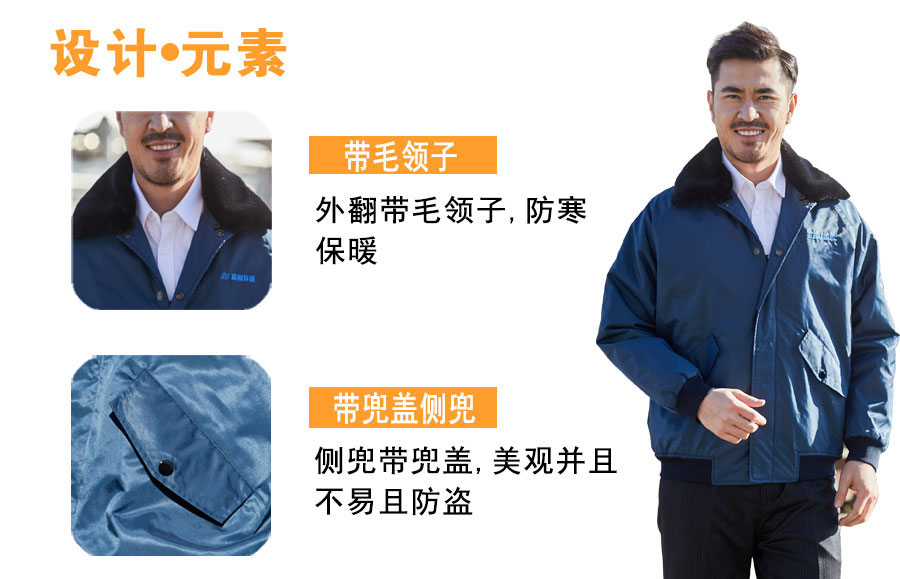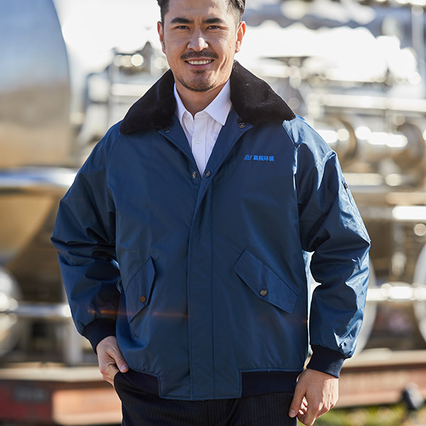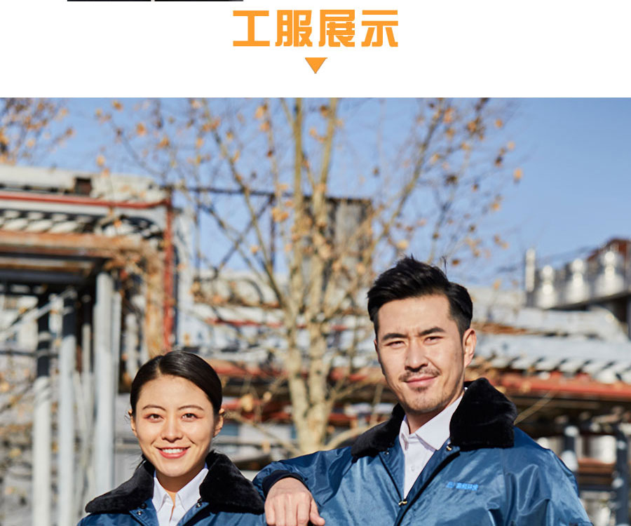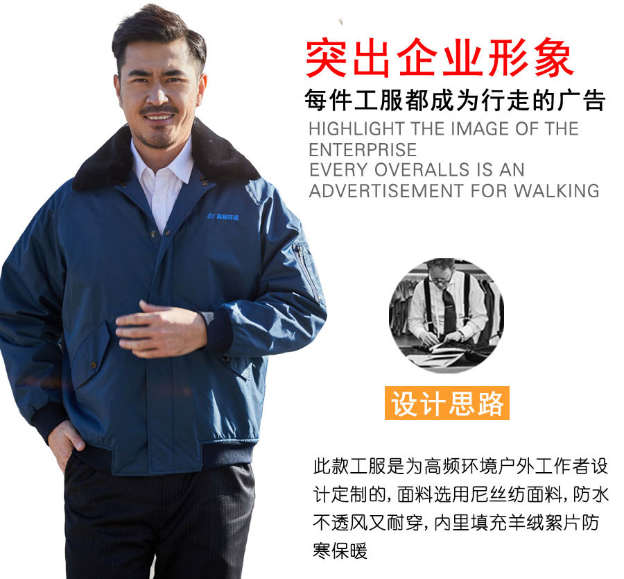 高频环境男棉服工作服是工服美设计制作的工作服棉服,此款棉服整体较为时尚,面料为亮光面料,领子为黑色茸领,侧兜为比较个性的防盗兜,整体风格较为时尚