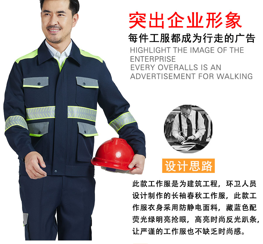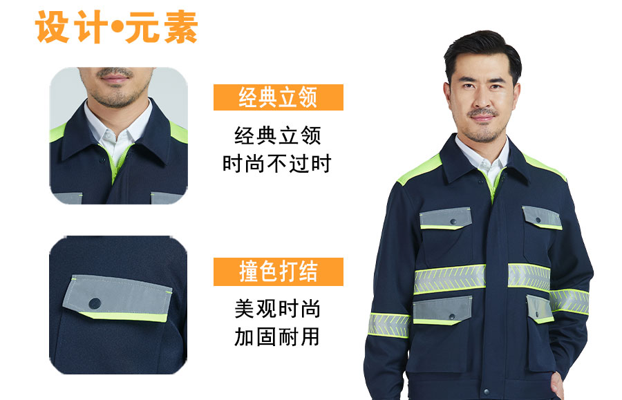 此款工服采用全新版型设计,此款工服大量采用高亮分光条加荧光绿配色设计,非常适合消防作业等特殊行业,工服面料可替换阻燃或者特种面料设计制作