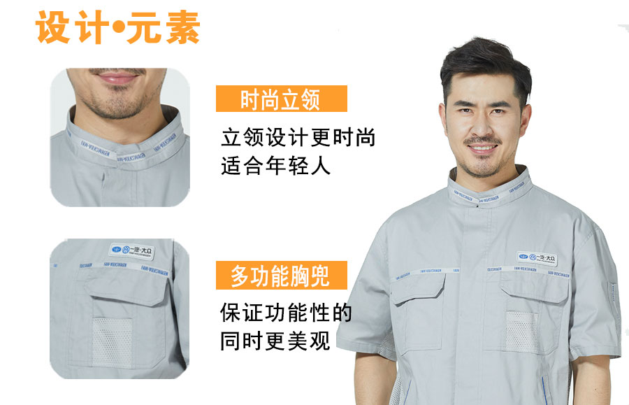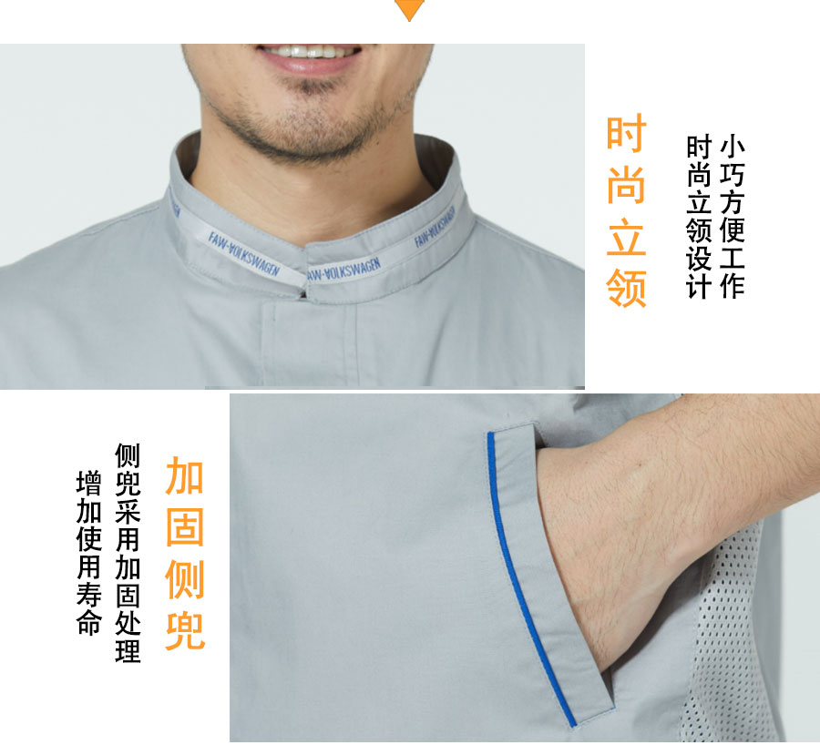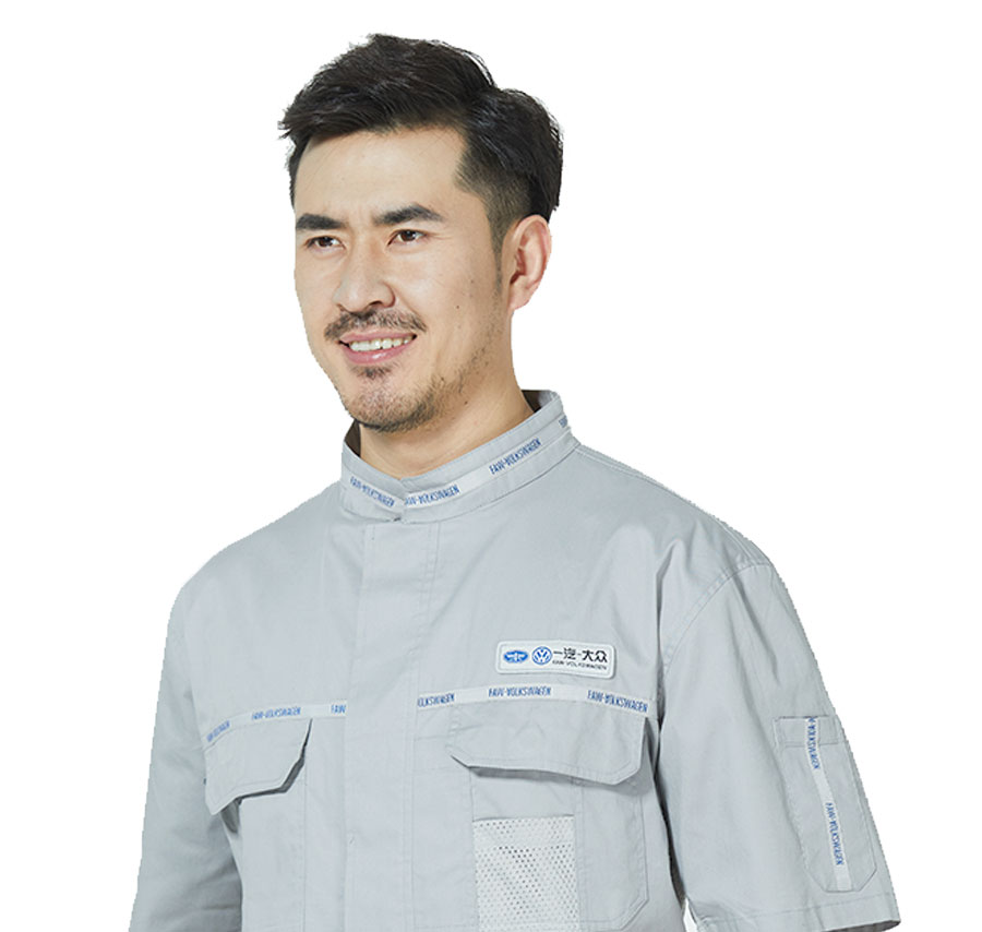 此款工作服是工服美为一汽大众生产的夏季工服,此款工服整体无明扣设计防止划伤车漆,腋窝,下摆,后背处均有透气处理,排汗更清凉